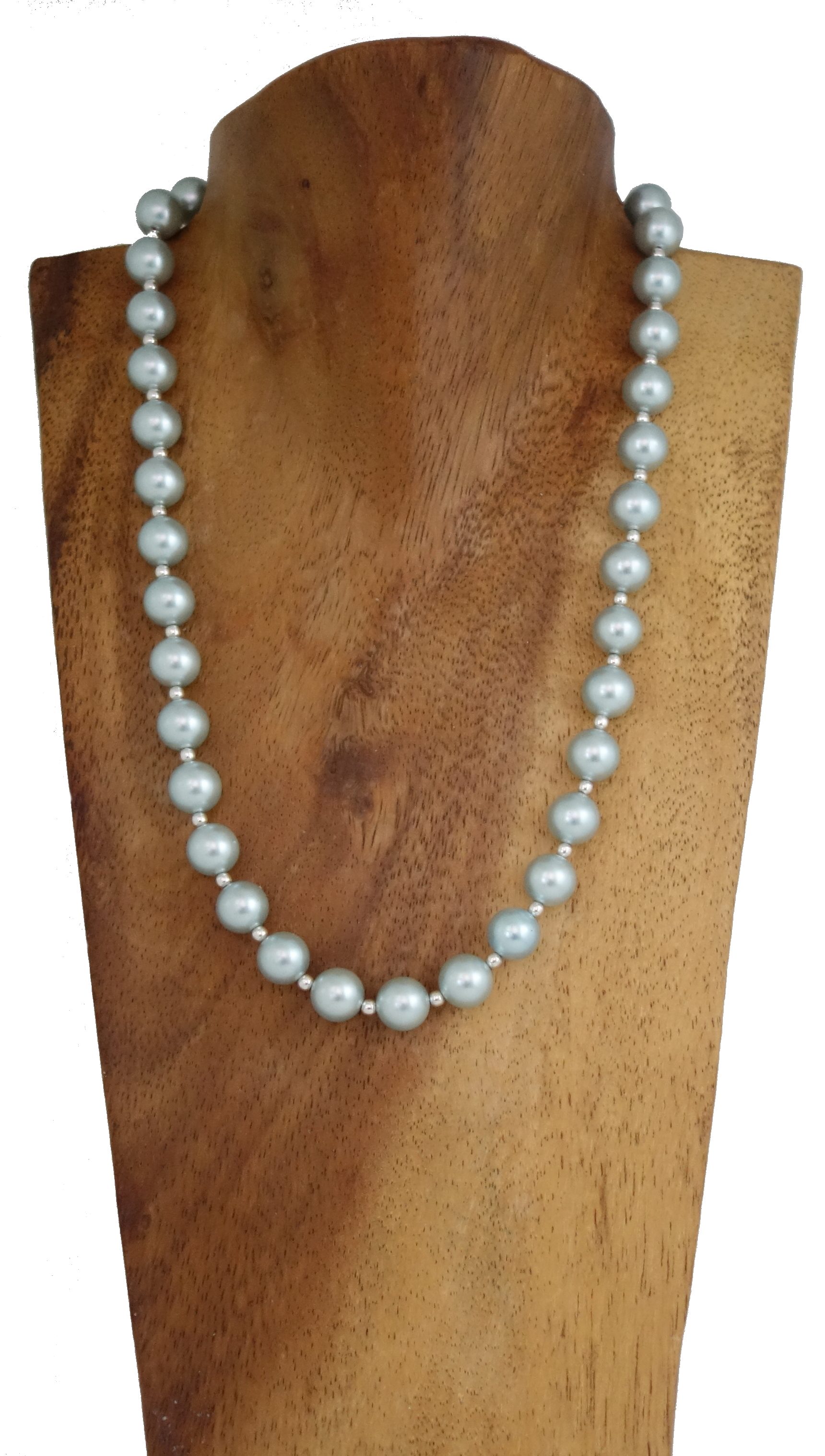 Halskette aus Muschelkernperlen blassgrün (Ø 10 mm) & Silber Perlen 925er (3 mm), aufgezogen auf hochw. Juwelierdraht.
