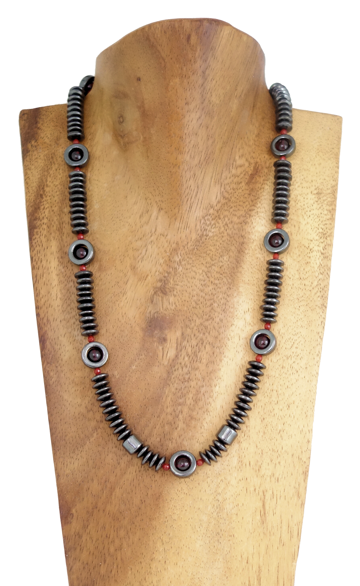 Halskette aus Granat Perlen (Ø 7 mm), Karneol facettiert (3 mm), Hämatit Ringe (12 mm) und Hämatit Tonnen (8 x 8 mm) aufgezogen auf 51 cm langen hochwertigen Juwelierdraht.