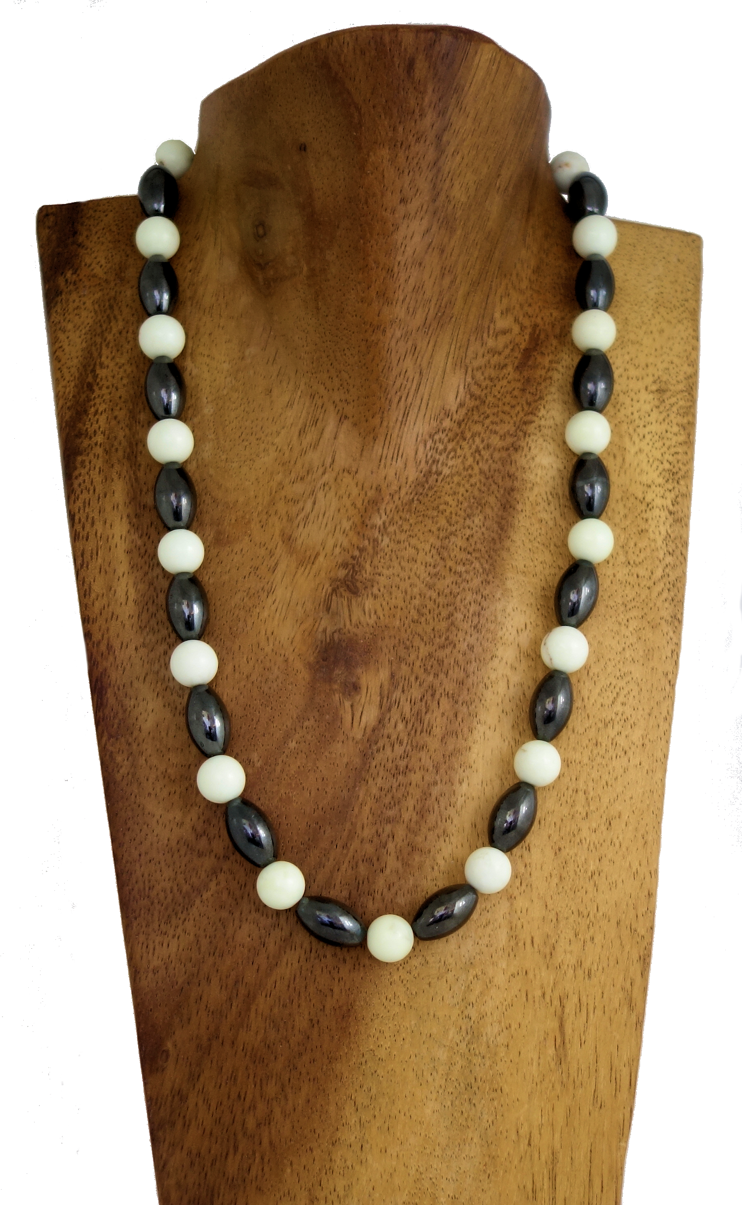 Halskette aus Lemon Chrysopras (Ø 10 mm) & Hämatit Oliven ( 15 x 10 mm) aufgezogen auf hochw. Juwelierdraht.