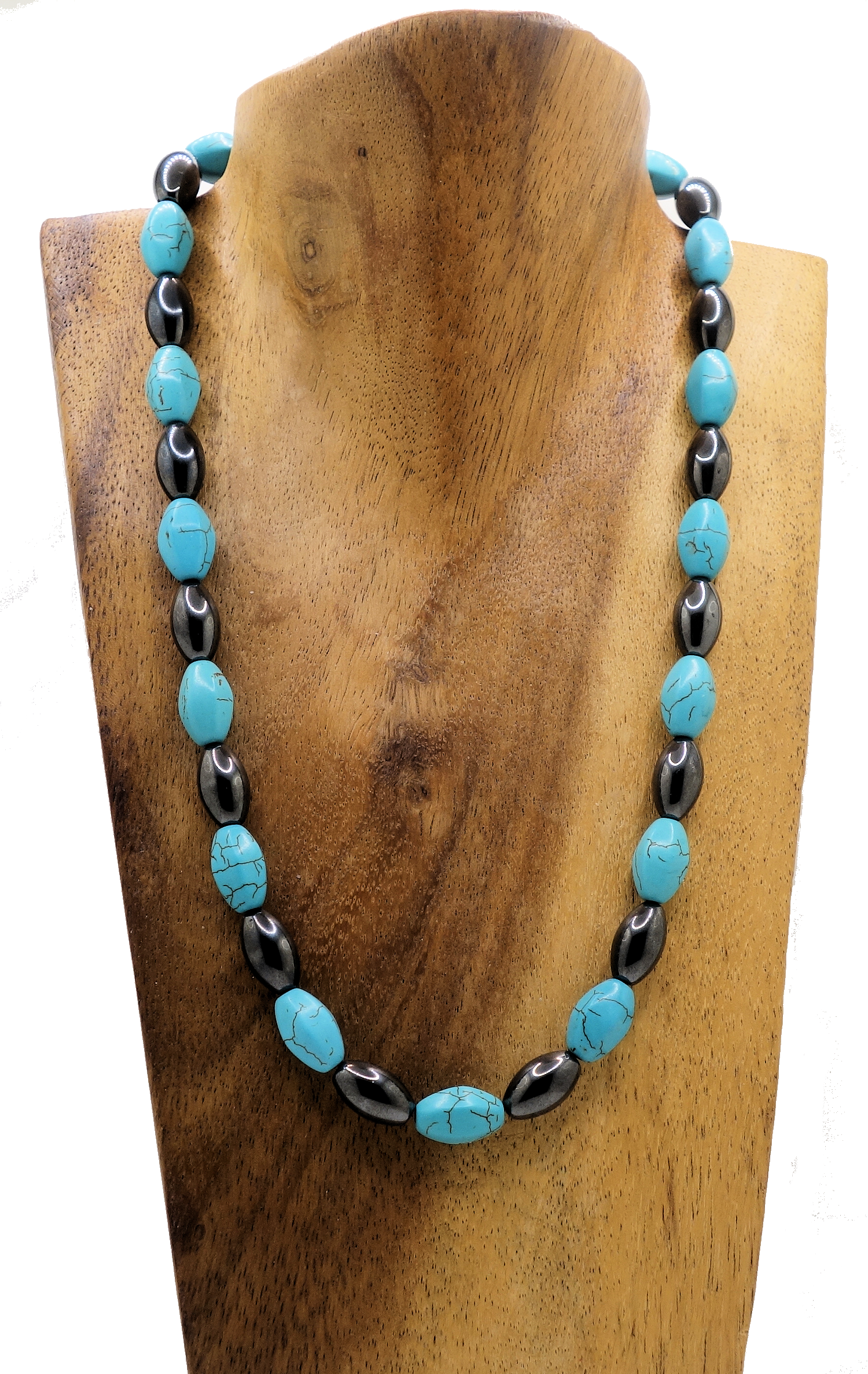Halskette aus Türkis ovale (rek.) (Ø 15 x 10 mm) & Hämatit Oliven ( Ø 15 x 10 mm ) aufgezogen auf hochw. Juwelierdraht.
