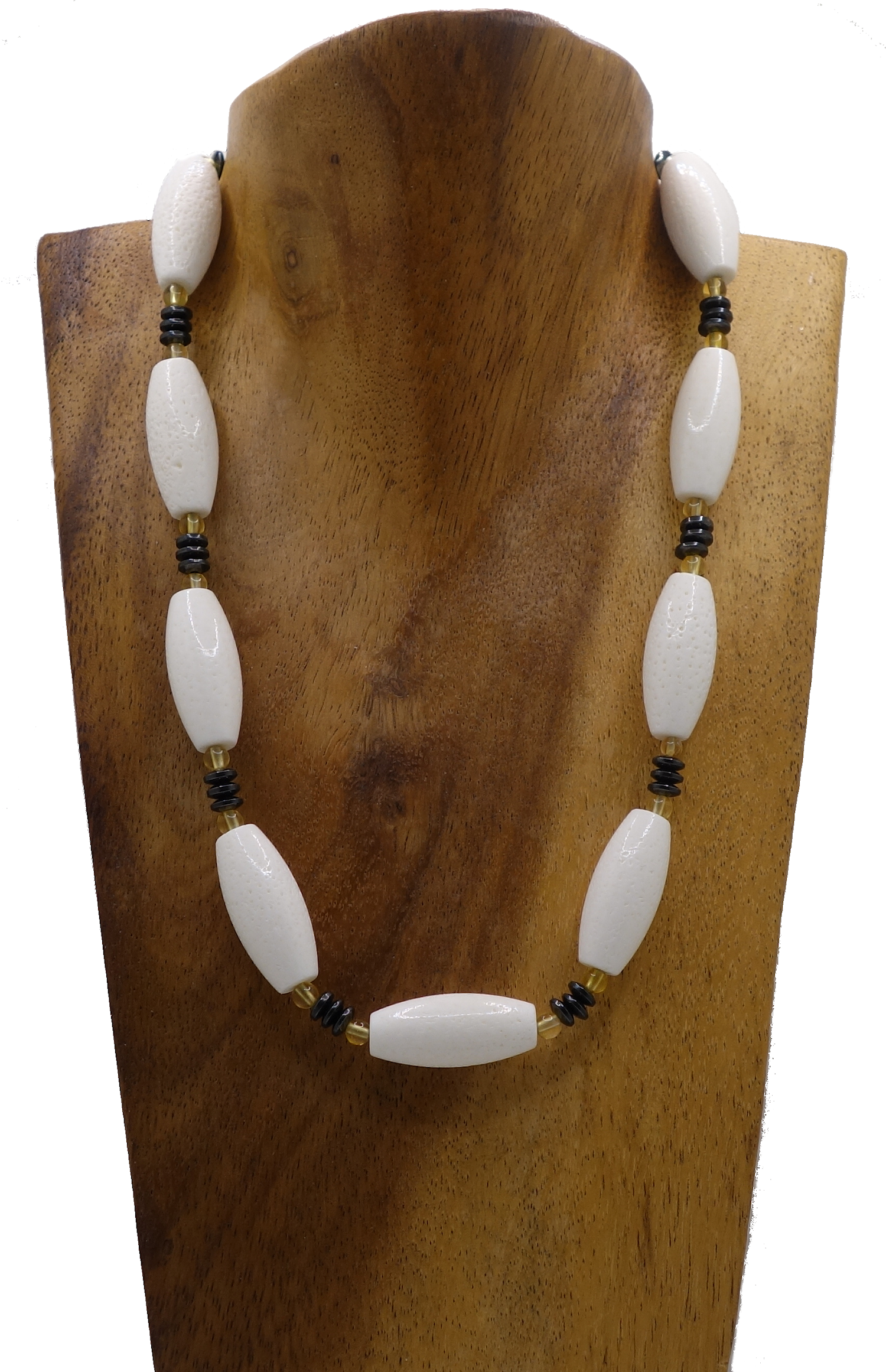Halskette aus Weiße Koralle (Ø 30 x 13 mm), Hämatit Linsen (Ø 6 mm) & Citrin Kugeln (Ø 4 mm) aufgezogen auf hochw. Juwelierdraht.