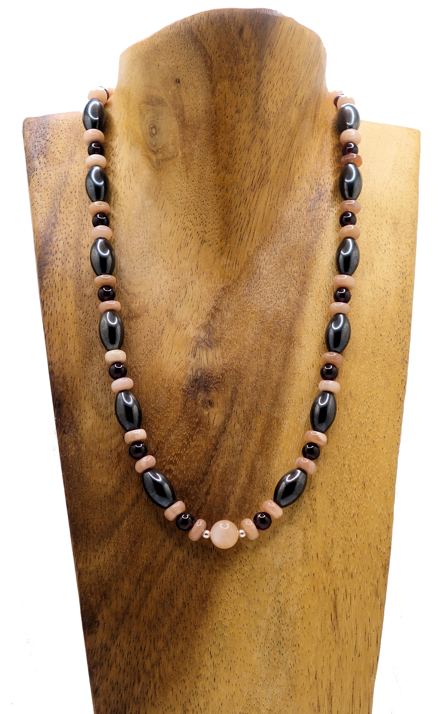 Halskette aus Sonnenstein, Mondstein, Hämatit, Granat & Silber