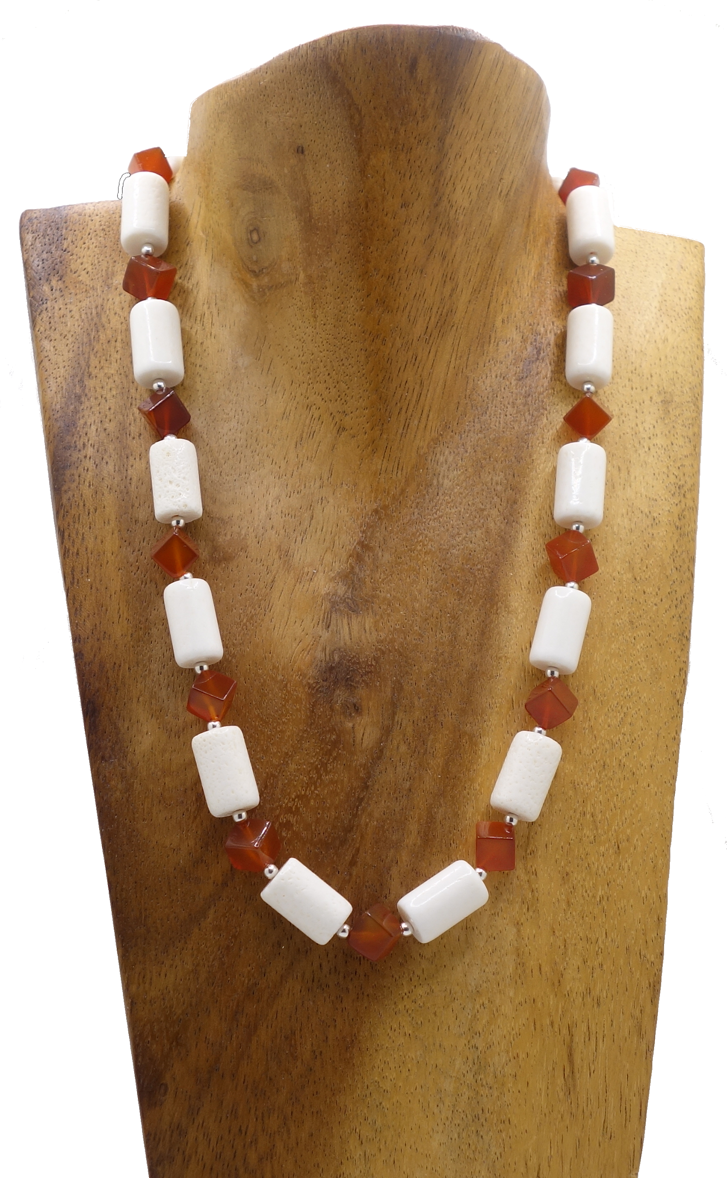 Halskette aus Weiße Koralle, Karneol Würfel & Silber