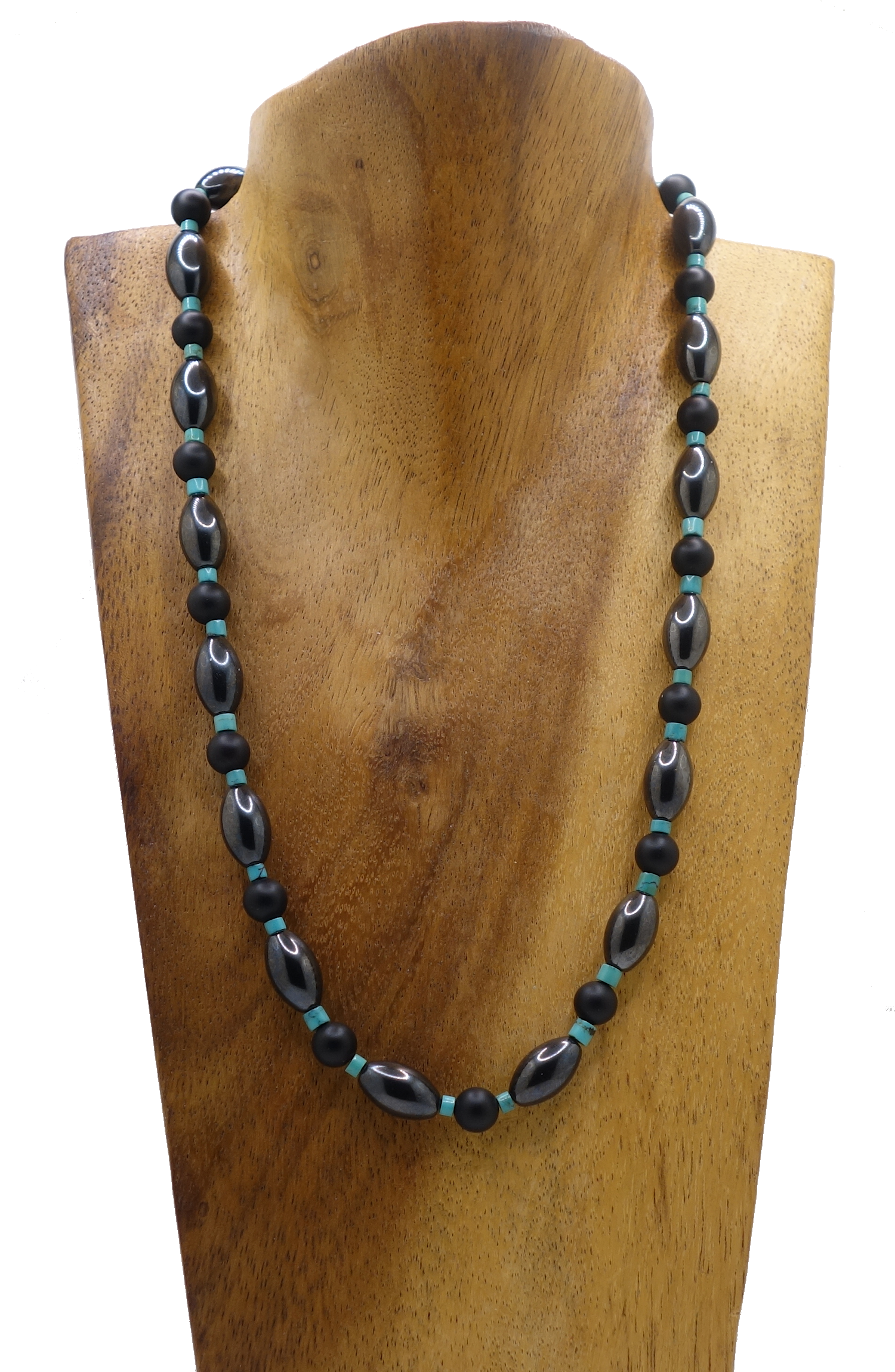 Halskette aus Hämatit Oliven, Türkis Scheiben & Onyx Kugeln beh.