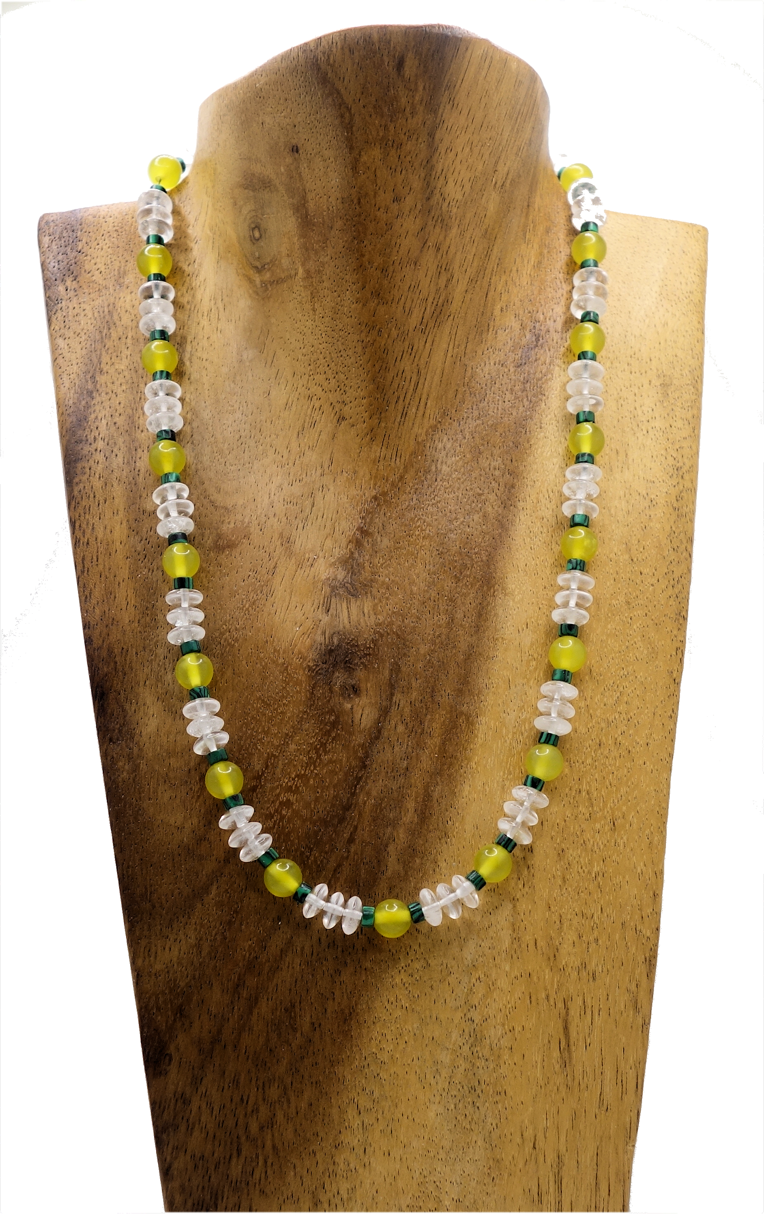 Halskette aus Bergkristall crashed Linsen (Ø 8 mm), gelbe Jade Kugeln AA (Ø 8 mm) & Malachit Scheiben (Ø 4 x 2 mm) aufgezogen auf hochw. Juwelierdraht.